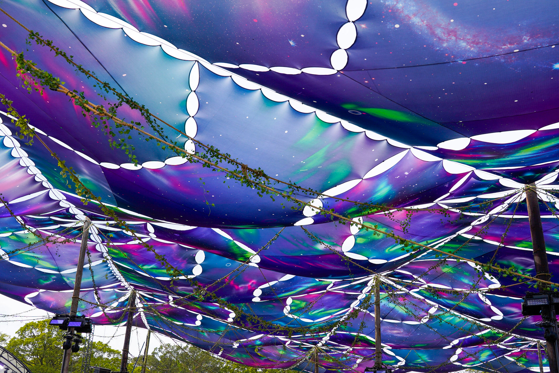 An aurora themed artwork was developed featuring multi layered UV printing mixed with a digitally recreated night sky featuring the northern lights. The entire canopy was broken into 196 individual pieces to distribute tension and allow airgaps for wind control.