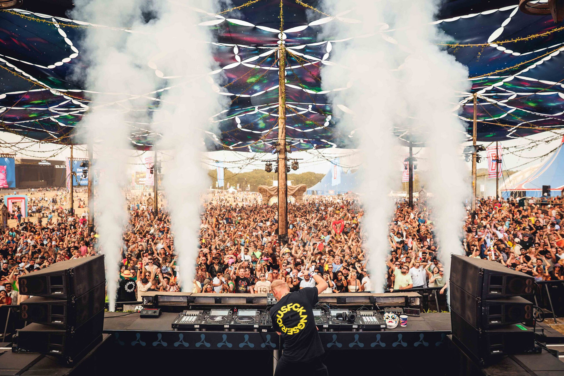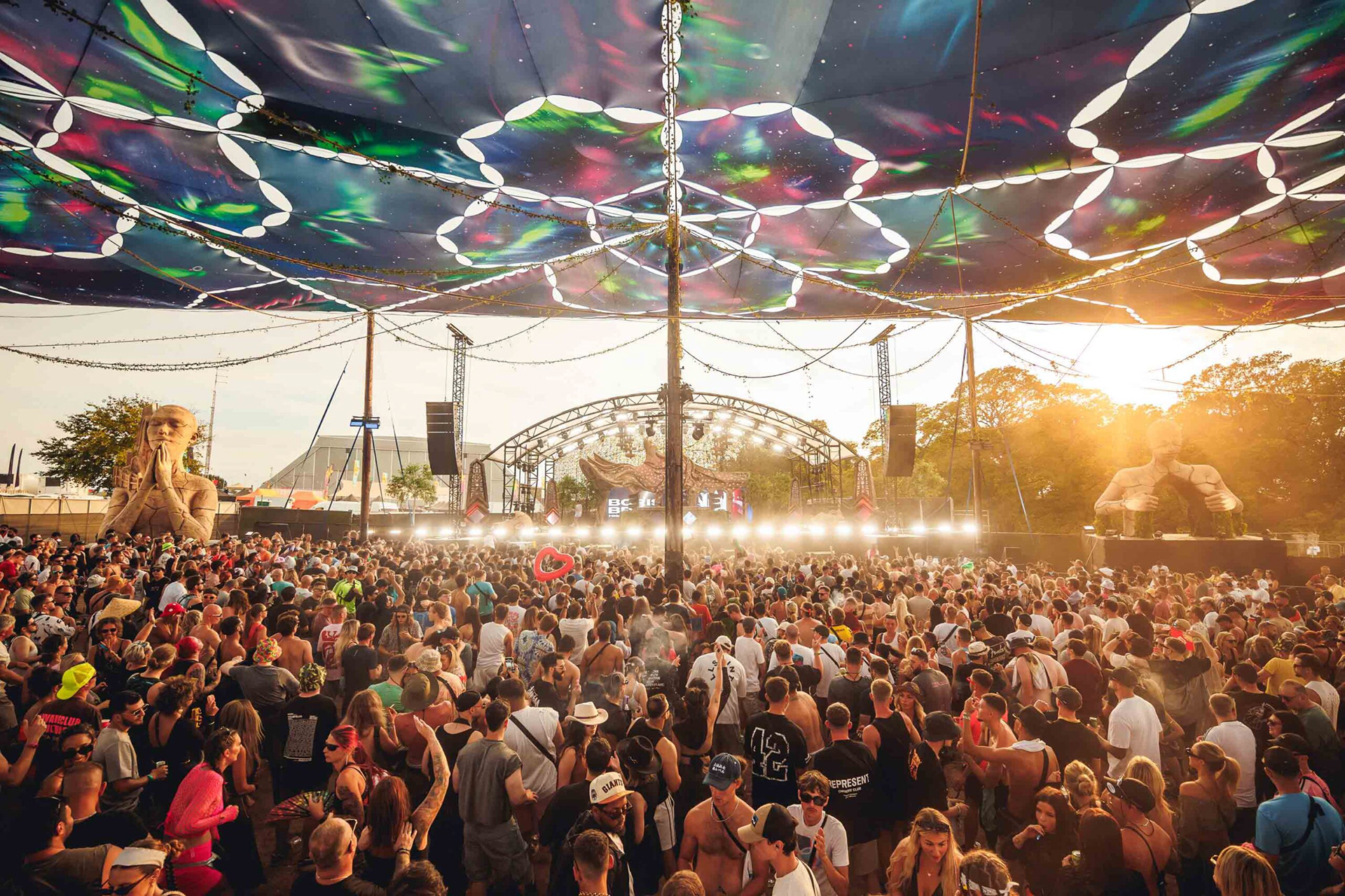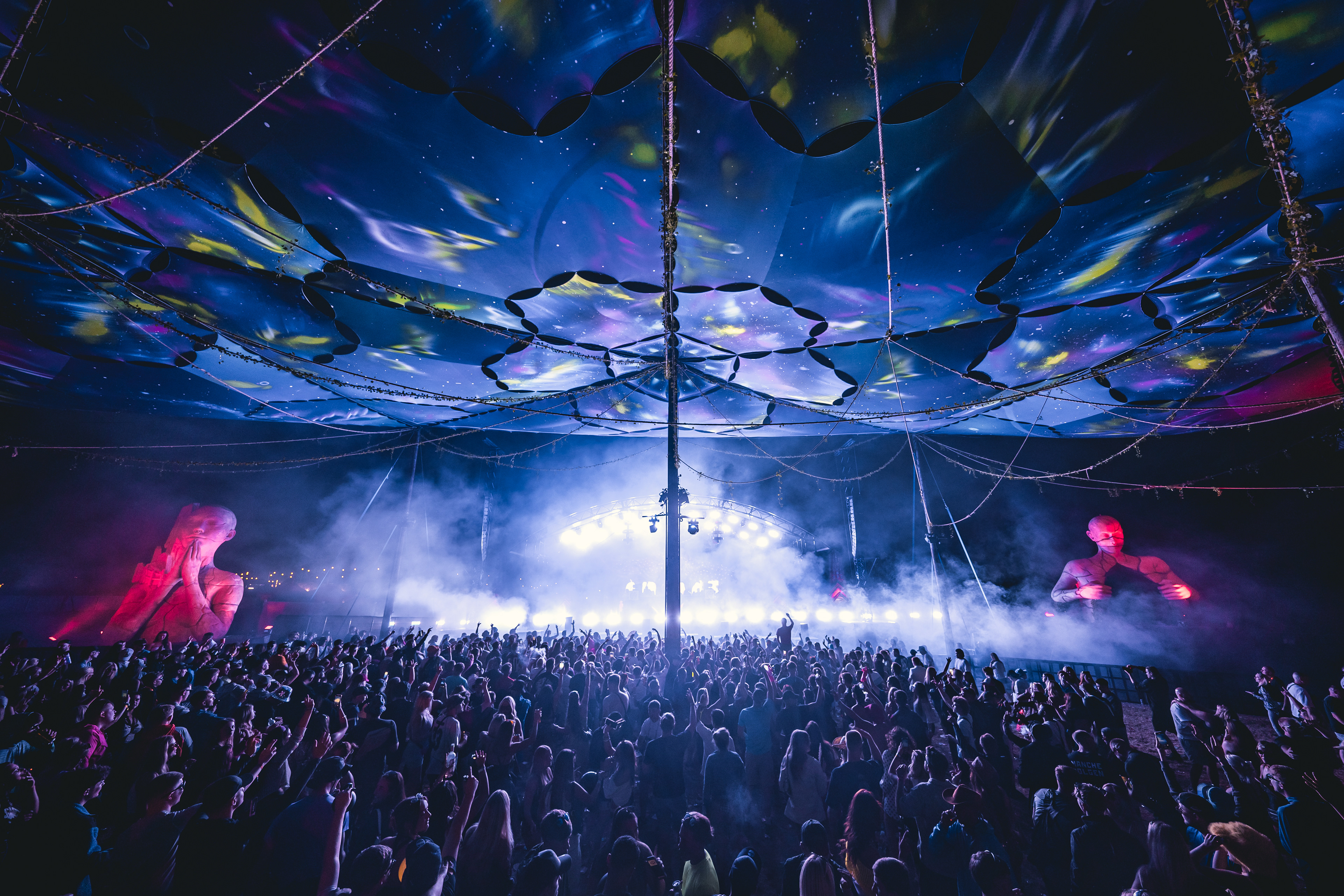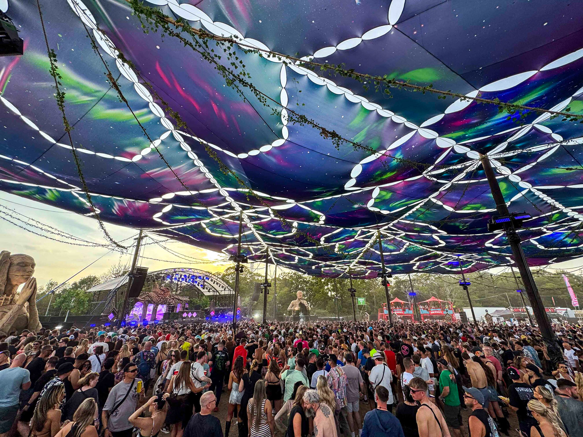 Creamfields is the UK's most prestigious electronic festival drawing daily crowds of over 70,000 music fans across it's various stages. For 2025, we were roped in by Visual Architects to design a massive canopy to complete their arena featuring giant surreal human figures on stage and around the site.